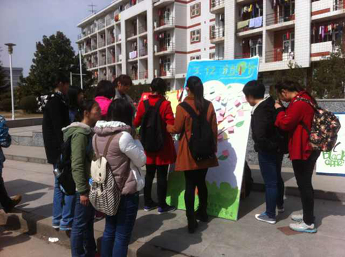 活动以当前雾霾现象为视点,以植树节为契机,通过宣传板、海报等形式展开。伴随着轻扬的音乐,志愿者向过往同学积极发出倡议,号召大家“告别雾霾,从植好一棵树开始”。活动吸引了很多同学驻足,同学们纷纷书写环保标语,传递绿色希望,通过常青树表达了对构建“最美校园”的殷切期望。