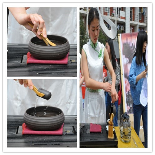 在茶艺表演过程中,茶艺队队长王璇分步讲解了泡茶的各个流程,如备器、温壶、赏茶、润茶、泡茶和出汤等,端庄柔和中蕴藏的的中庸之道让观众们叹为观止。茶艺队队员们为观赏、过往的同学们分发茶知识宣传单,讲解茶与健康、茶艺与茶文化、茶与品质生活等方面的知识,说明茶对人体的营养价值和保健功能,表达了茶艺术这一传统文化的博大精深,体现了中国人“以和为贵”的生活态度。现场讲解得到了同学们的热烈掌声,并将整个活动推向了高潮。