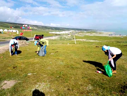 8月是青海湖旅游旺季,游客们对青海湖的生态破坏也不容小觑。在沿途休息间隙,队员们自行组织捡拾垃圾。